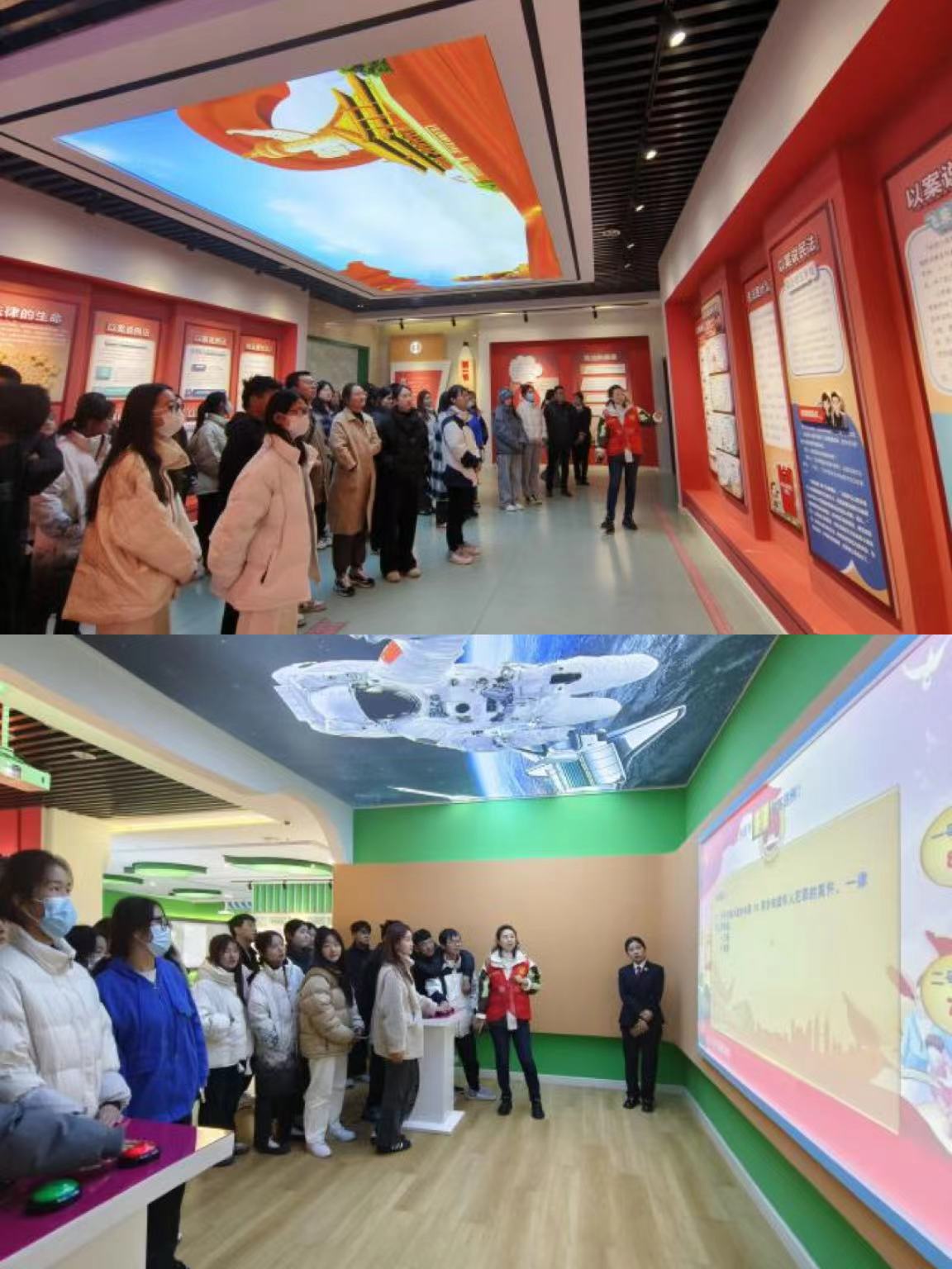 最后一站来到了市检察院法治展厅,在漯河市检察院检察官的引导下,老师和学生们依次参观了“光明指引”“引以为戒”“以爱之名”和“为了明天”四个展区,观看了警示教育宣传片,忘情地沉浸在知识海洋里。展厅还设置了法律抢答、职业场景虚拟成像,以及通过VR技术感受校园欺凌、吸毒前后面部对比等互动设备和体验游戏,以较强的互动性和参与性模式对参观者开展法治教育、安全教育和自护教育。活动最后,学生分组参与心理测评工作,帮助学生缓解压力,为学生培养了积极的思维模式、激发了学习的动力。