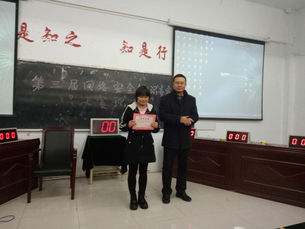 随后,网络安全知识竞赛正式开始。第一个环节是必答题环节,第二个环节是抢答题环节,最后是风险加时题环节。在比赛休息间隙还有安排了,宣传防范网络诈骗的双簧表演、吉他演奏《那些年》、歌曲《七里香》、朗诵《世界上最遥远的距离》等文艺节目。现场气氛活跃,比赛紧张精彩。经过角逐,最终评出一等奖一名,二等奖两名,三等奖三名,优秀奖六名。王主任为获奖选手颁发了证书和奖品。