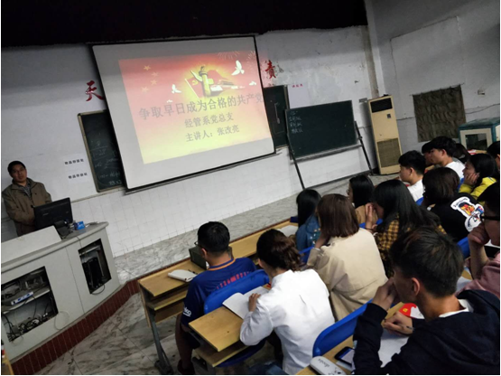 2018年4月19日晚上7点,在2303会议室,经管系党支部张改亮书记为经管系42期入党积极分子讲党课。