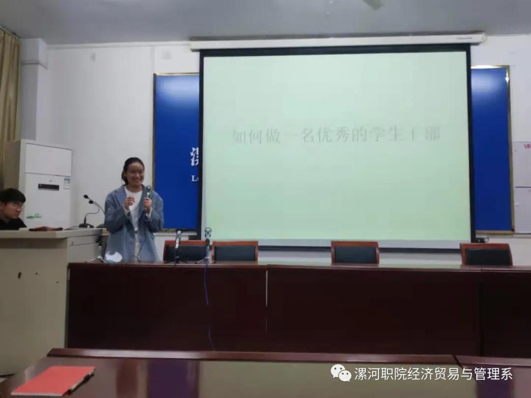 第四次会议中冯妍学姐、周世平同学和窦宾生同学也给我们讲述了什么是一名合格的学生干部以及如何成为优秀的学生干部。