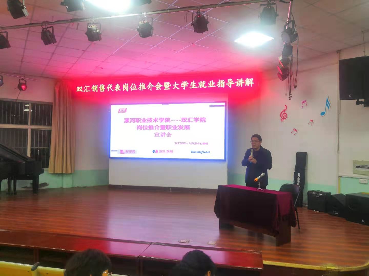 3月24日晚上,双汇集团人力资源部副总潘硕在小礼堂为200多名在校生,做了双汇销售代表岗位推介会暨大学生就业指导讲解。双汇学院党总支书记张改亮主持。