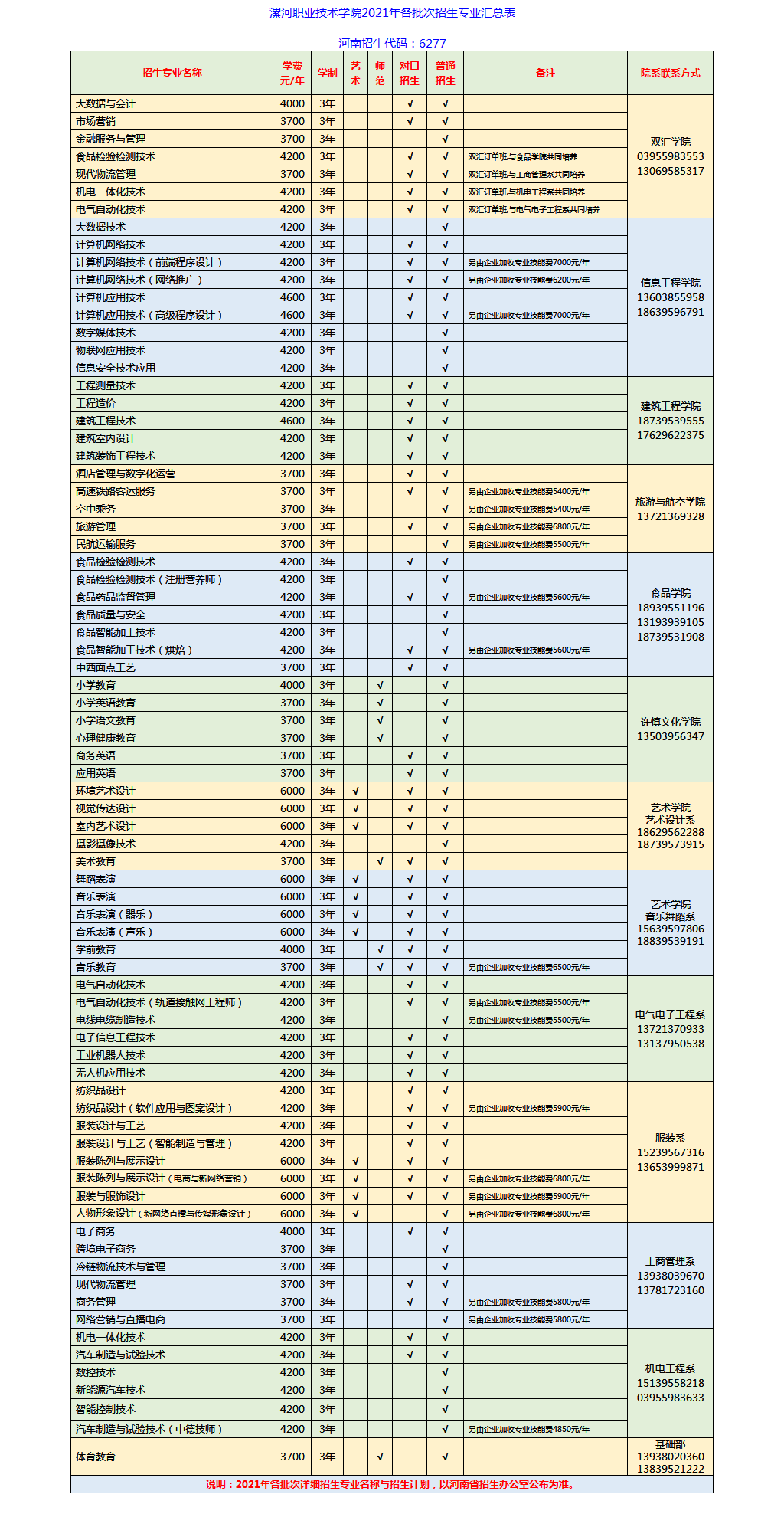 漯河职业技术学院2021年各批次招生专业汇总表