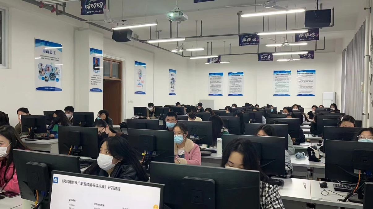 在系领导和教研室老师的细心策划组织下,我系于2022年11月18日下午,启动了1+X网店运营推广职业技能等级证书的培训工作。本次培训主要针对2021级电子商务、跨境电子商务、网络营销与直播电商专业学生。为了不影响学生其他课程上课学习,培训主要利用周末和晚上时间进行。经过前期老师们的动员和选拔,本次参加培训学生210人左右。由于学生较多,本次培训分三组进行,分别由荣长玲、娄艺、李君芳三位老师担任组长,以小组为单位,组织教研室老师和相应班级学生进行培训。本次培训由实训室主任杨志明老师负责协调并保障培训机房正常运行。