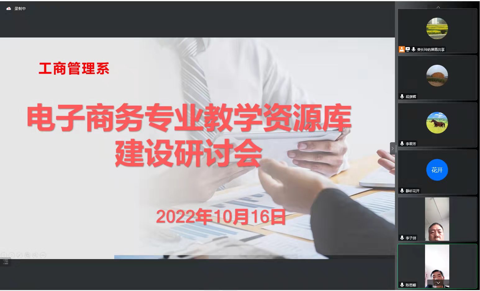 2022年10月16日下午15:30,我系在腾讯会议上召开了电子商务课程资源库建设会议,会议由教学主任李子剑同志主持,系主任陈思顺同志以及课程资源库各门课程的负责人都参加了该次会议。会上,课程负责人针对以下四个问题展开了热烈讨论:(1)到目前为止,各门课程进展情况汇报;(2)在各门课程建设过程中,有哪些困难?自己已经采取了哪些解决办法?还需要协调哪些工作?(3)在课程资源库建设过程中,有哪些特殊的技术要求?(4)在课程资源库建设过程中,有没有组建工作团队?团队成员分工科学合理吗?团队成员有没有进入角色?