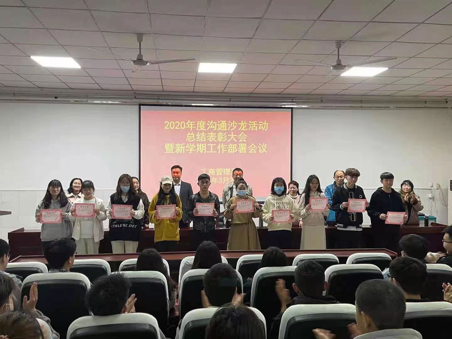 2021年3月26日下午,工商管理系在学校3101会议室举办了2020年度沟通沙龙活动总结表彰大会暨新学期工作部署会议,工商管理系党总支书记安国彦、办公室主任黄晓喆、团总支书记赵秋涛和部分教师及2020级全体学生参加了会议,会议由赵秋涛主持。