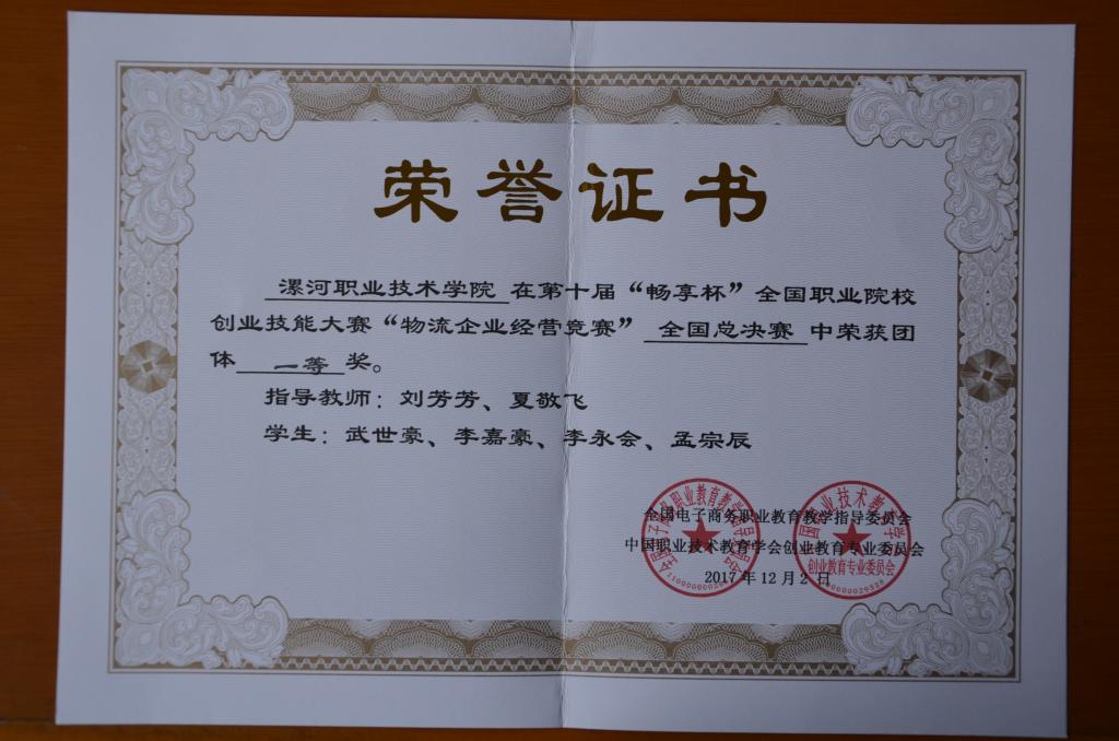 2017年12月2日,第十届“畅享杯”全国职业院校创业技能大赛暨物流企业经营技能竞赛全国总决赛在湖北武汉举行。我院工商管理系荣获团体一等奖一项,三等奖一项,再次展现了我院物流管理专业的办学实力。