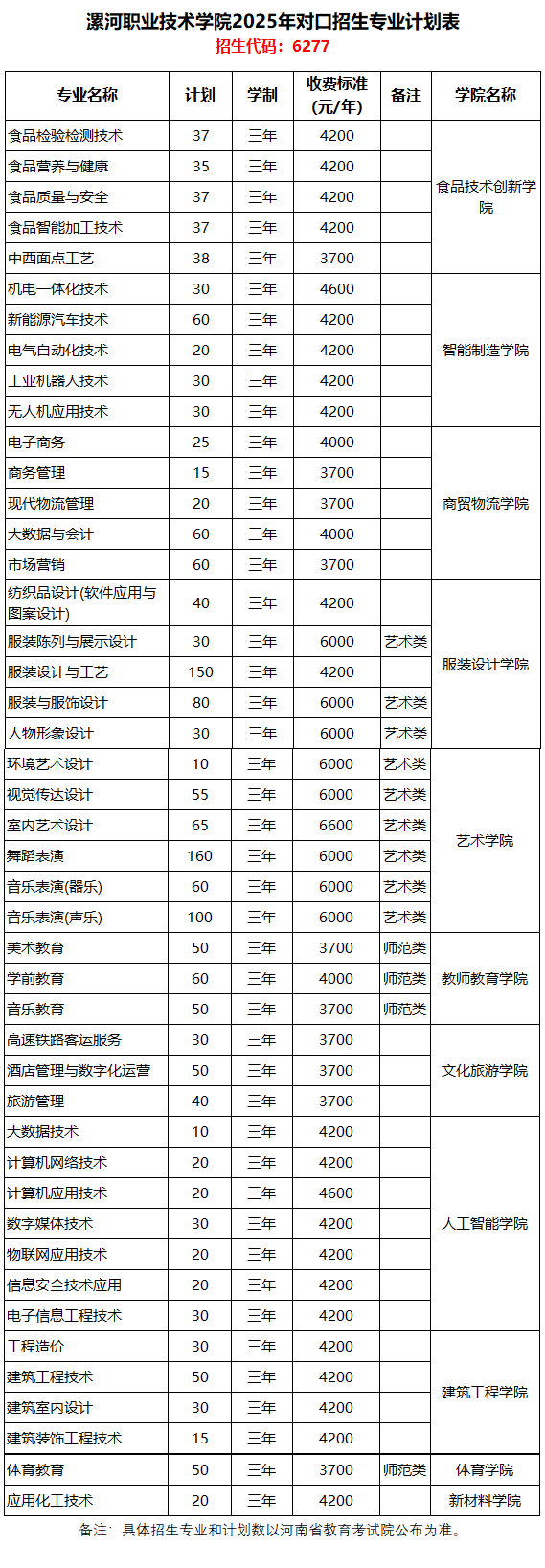 漯河职业技术学院2025年对口专业招生计划