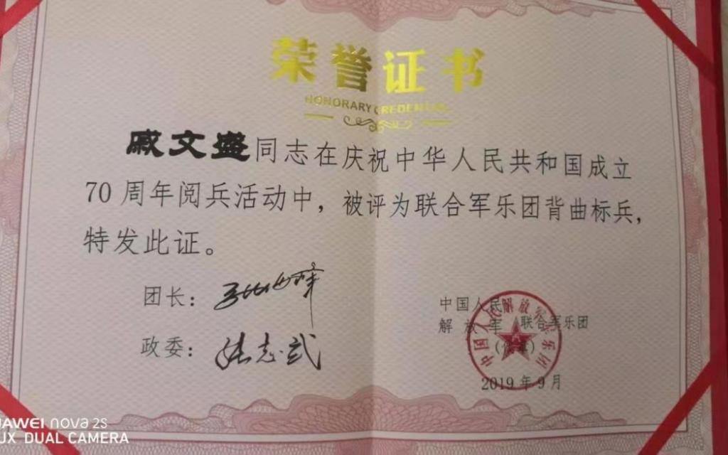 戚文盛,2019年毕业于漯河职业技术学院商务管理专业。在校期间积极向上,在庆祝中华人民共和国成立70周年阅兵活动中,以联合军乐团成员身份接受祖国检阅。因其出色表现,获评联合军乐团背曲标兵,以青春热血彰显军人风采与学子担当。