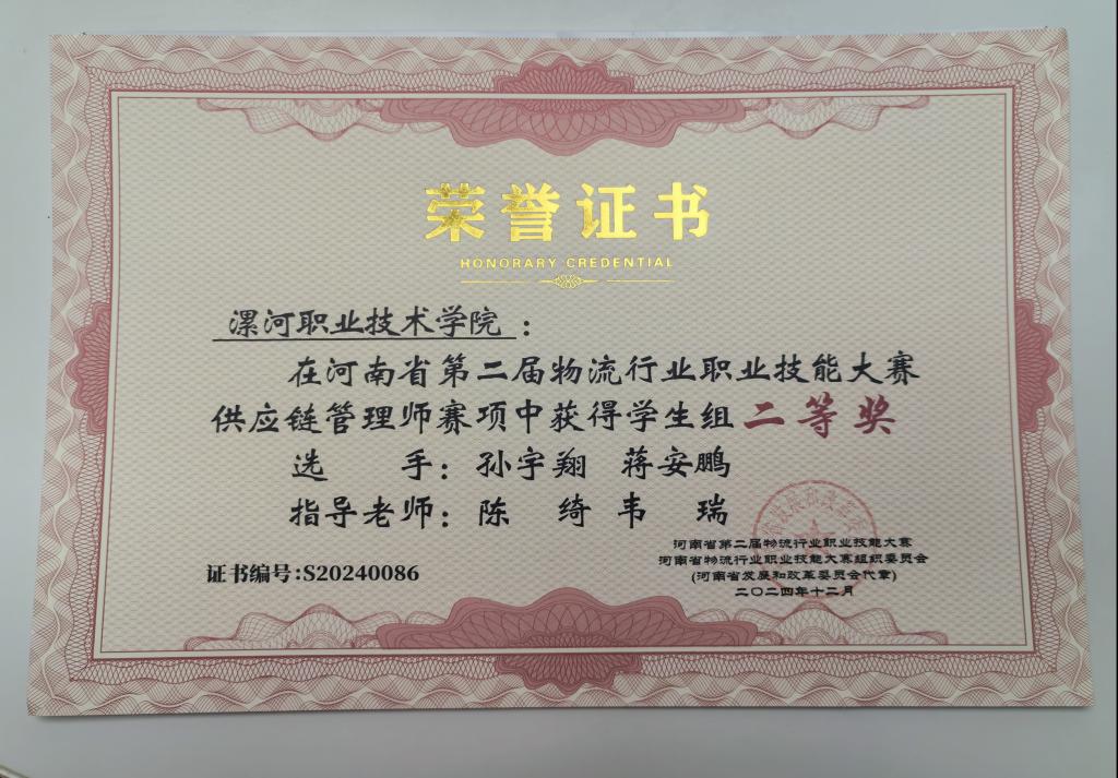 孙宇翔、蒋安鹏同学获得河南省第二届物流行业职业技能大赛供应链管理师赛项中获得学生组二等奖