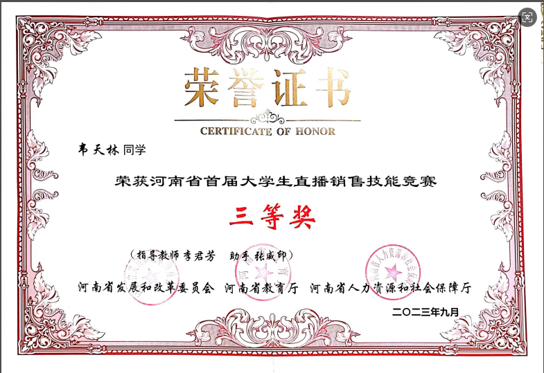 韦天林同学获得河南省首届大学生直播销售技能竞赛三等奖